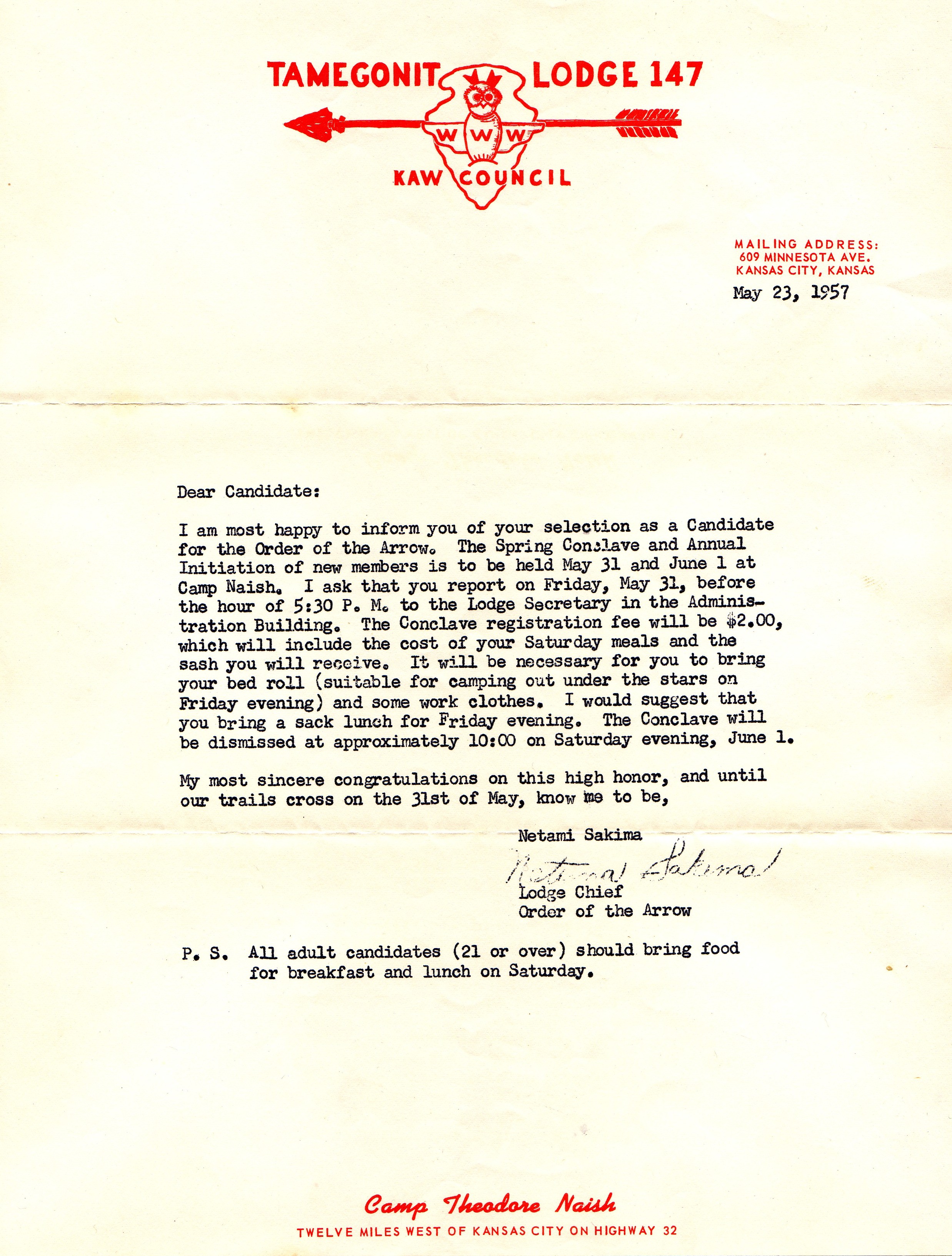 An interesting bit of emphemera…Tamegonit Lodge stationery dating from 1957 inviting an elected candidate to Camp Naish for induction into the Lodge. It provides some insight into how lodge inductions were done at that time. It appears that “Initiations” were held annually at the Spring Conclave as opposed to the frequent induction ceremonies at summer camp and on varios spring and fall weekends the lodge hosts now. Another interesting note is the inviation to bring one’s own sack lunch for use during the Ordeal. If I had known that was an option, I would have brought something more substantial than a cheese sandwhich, hard-boiled egg and an apple!