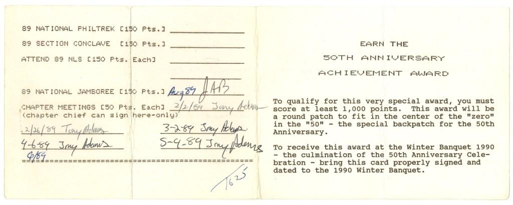 It is hard to believe that it has been twenty years since my first year as a Boy Scout camping at Camp Naish. 1989 was my first year as a camper and also the 50th anniversary of Tamegonit Lodge. In addition to the 50th anniversary flaps, here are a few interesting items that the lodge used to celebrate: