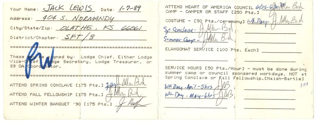 The X1 was available for purchase through the trading post as part of a set that included the three event patches. My mom gave me the money to buy this set during Camp Naish family night in the summer of 1990. Thanks, Mom! The X2 below was earned by my dad. Following is a scan of his scorecard.