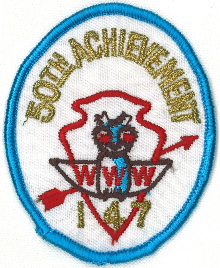 The lodge’s first two odd-shapes (X1 and x2) were issued as part of the Lodge’s 1989 50thAnniversary celebration. The event patches for this year (1989 Spring Conclave, 1989 Fall Fellowship, and 1990 Winter Banquet) combined to form the numeral “50”. The oval- shaped patches were intended to fit in the center of the “0” in the “50”. The X2 was awarded to members of the Lodge who accumulated enough points during the year based on attending different events (national and lodge), attending ceremonies and meetings, or working hours at Camp Naish.