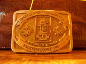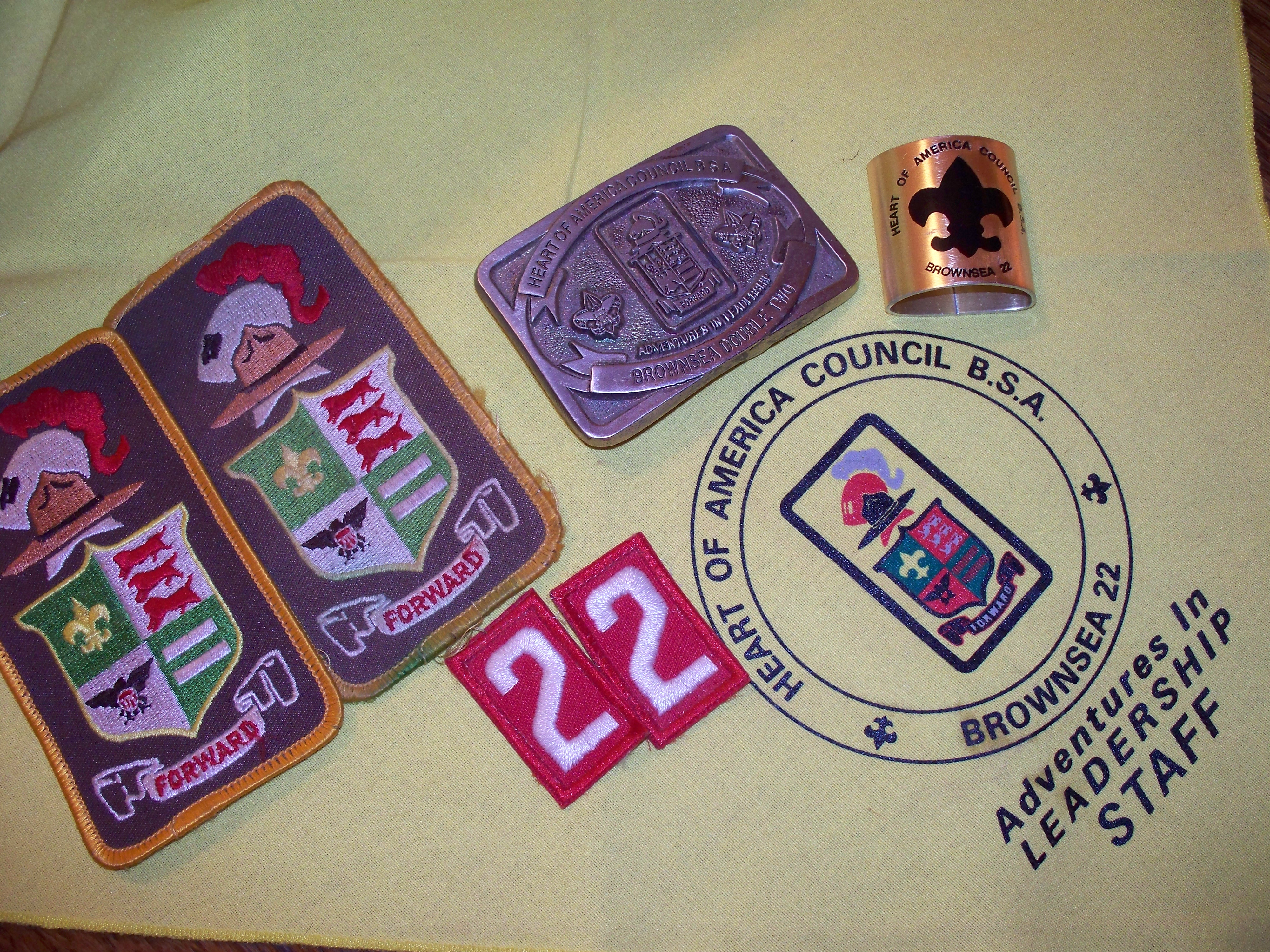 Yes!  A. Green sent along a few photos of the Brownsea items he earned/received when he participated as a camper and staff member in the early 2000s.  Included is the newer version of the belt buckle, a different neckerchief slide, staff neckerchief and participant patch (with yarn pocket loop).  Check it out: