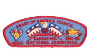 I took my son to McDonald’s for lunch over the weekend and while we were there, I spotted a Scouter and his son wearing their Class A uniforms.  What caught my eye was the Scouter’s gold bordered 1985 National Jamboree CSP from Heart of America Council.  I stopped to talk to them and it turns out that they had just come from working on his son’s Eagle Scout project.  We chatted about the Jamboree and Camp Naish (they both had multiple camper year segments on their shirts) and I wished them well.  Our meeting inspired me to share the following images of the 1985 Heart of America Council CSPs.  It is my understanding that the gold border version was for adult leaders, the silver border was for youth leaders and the red border was for participants/traders.  Interestingly, these are the first JSPs issued by Heart of America Council.  The council started in 1975, so they missed out on the 1977 and 1981 Jamborees.  Fortunately, they came up with these three for the Boy Scouts’ Jubilee celebration: