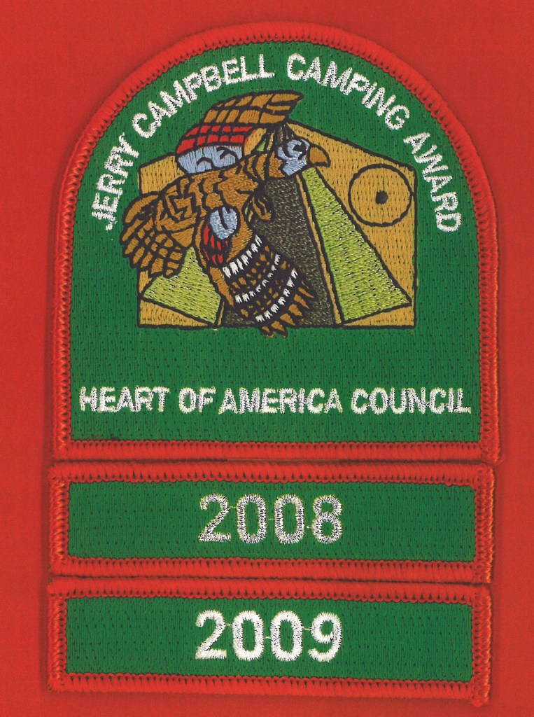 Next we have the Jerry Campbell Camping Award which is awarded by Tamegonit Lodge to troops that meet four requirements  including earning the 12 month camper discussed above.  The other requirements involve regular attendance by the Troop’s Order of the Arrow Troop Representative (or designee) at chapter meetings, current registration by all Troop Arrowmen, and writing a 100-word minimum essay regarding, “How my Troop exhibits Brotherhood and Cheerful Service throughout the year”.