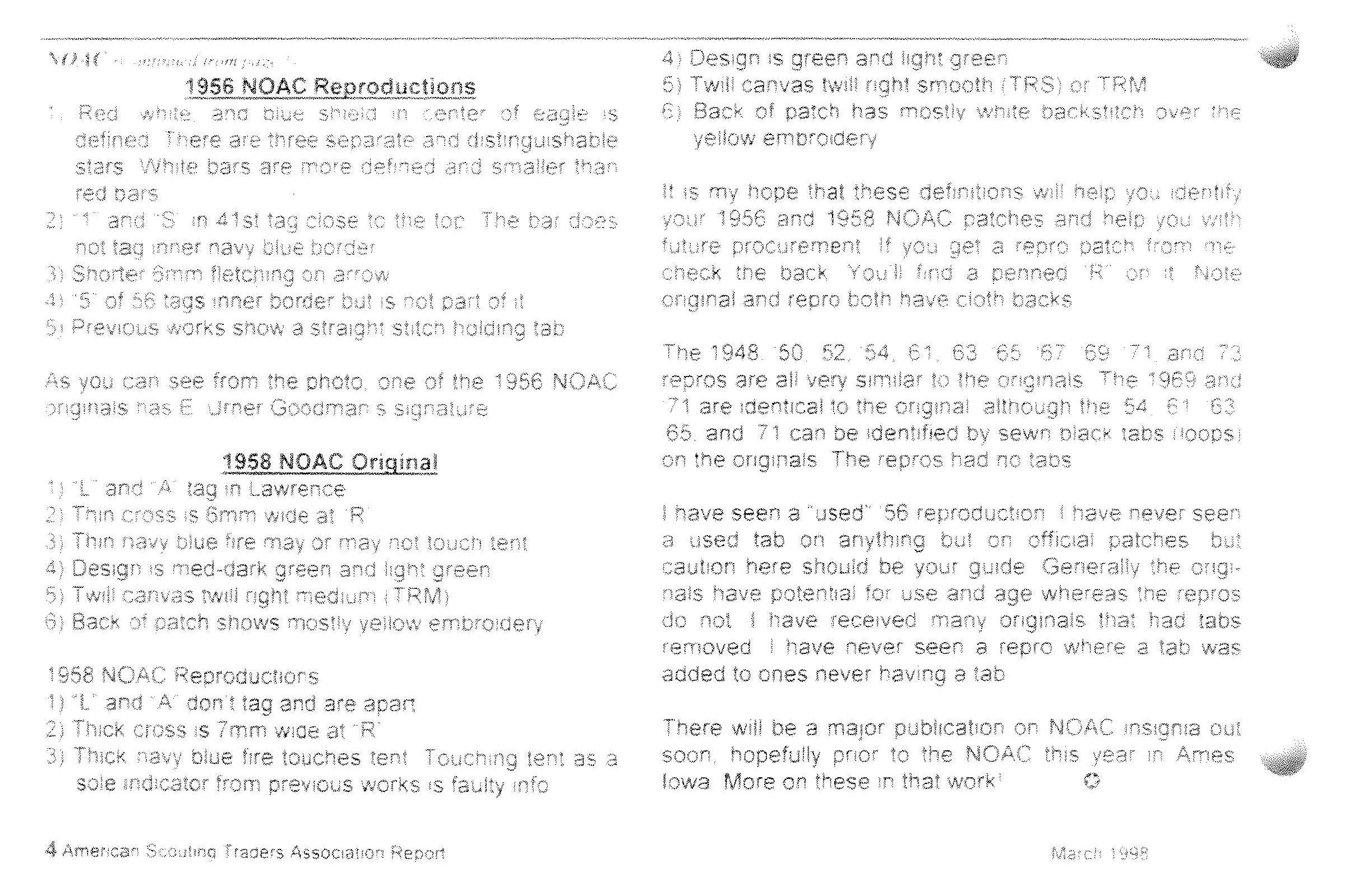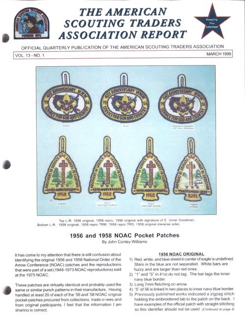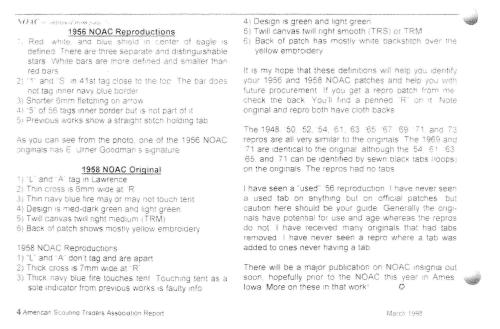Given that the University of Kansas in Lawrence, Kansas was the site for the 1958 National Order of the Arrow Conference (NOAC), it is only right for Tamegonit/Kansas OA collectors to add a 1958 NOAC pocket patch to their collection. The question is: when you find one, is it an original or a reproduction? The following images are from the March 1998 American Scouting Traders Association Report feature article by John Conley Williams which provides some guidance on how to differentiate between the original and the reproduction patches. The article notes that the reproductions were sold at the 1975 NOAC. If I dig up a scan of the real and original, I’ll post those as well.